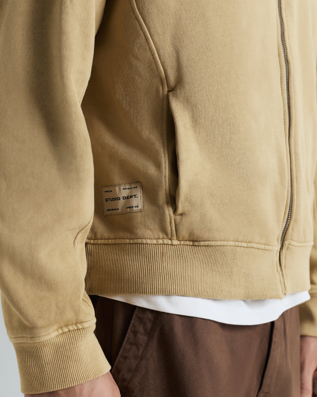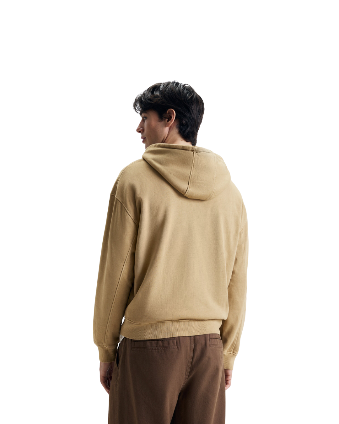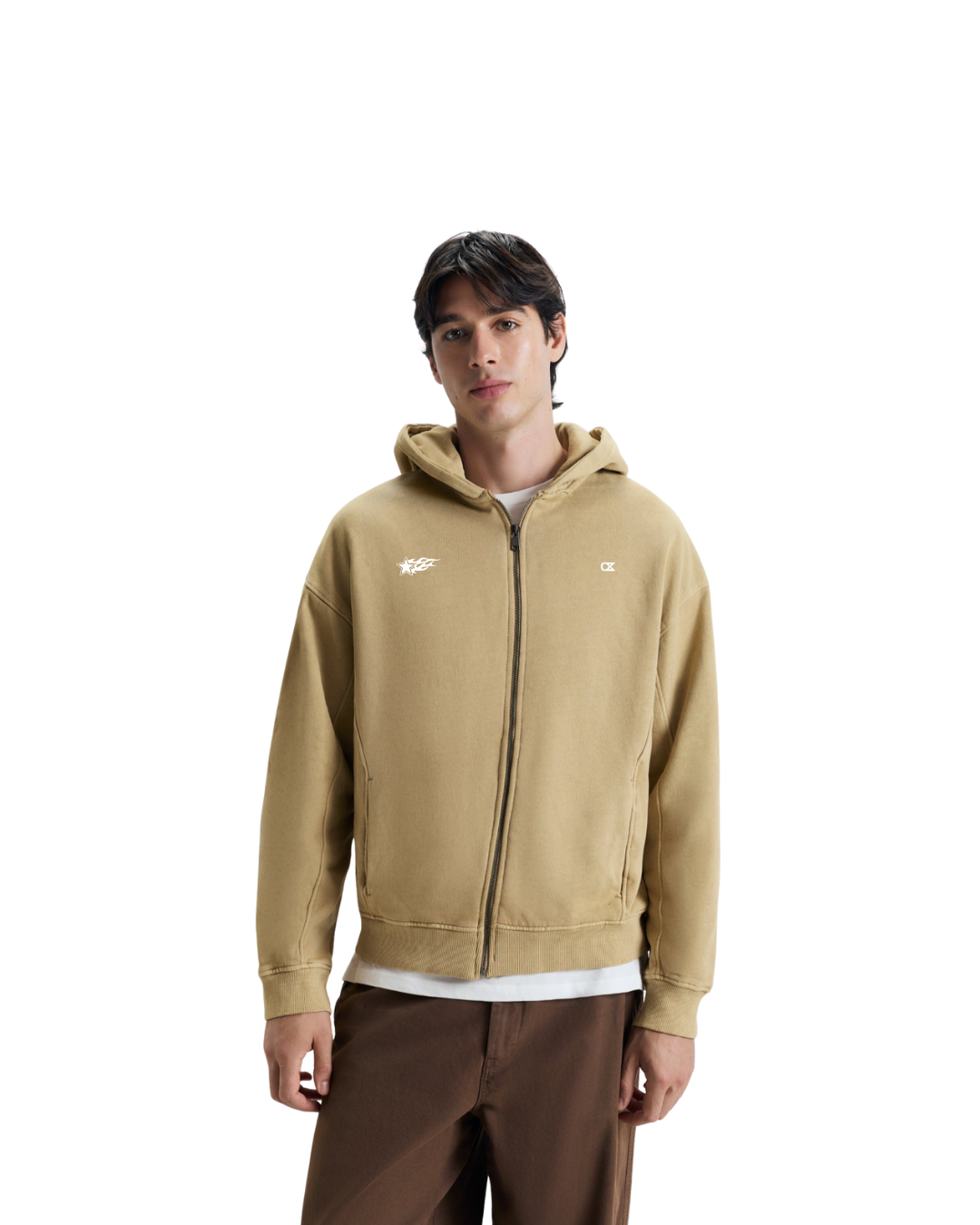 Sudadera de corte boxy oversize, pero oversize de verdad. Con cierre frontal de cremallera. Cuenta con dos bolsillos laterales. Tiene puños y bajo acabado en canalé elástico. Es de corte ligeramente holgado y está confeccionado en un tejido garment dye.
