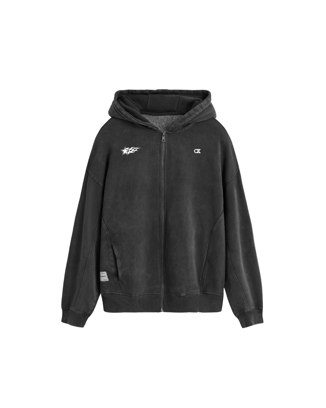 Sudadera de corte boxy oversize, pero oversize de verdad. Con cierre frontal de cremallera. Cuenta con dos bolsillos laterales. Tiene puños y bajo acabado en canalé elástico. Es de corte ligeramente holgado y está confeccionado en un tejido garment dye.
